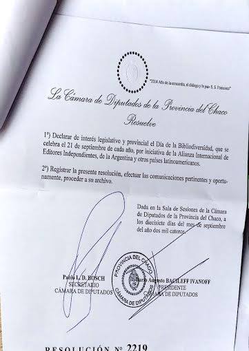 El Día Internacional de la #Bibliodiversidad ha sido declarado de interés legislativo y provincial por la Cámara de Diputados de la Provincia del Chaco, Argentina.