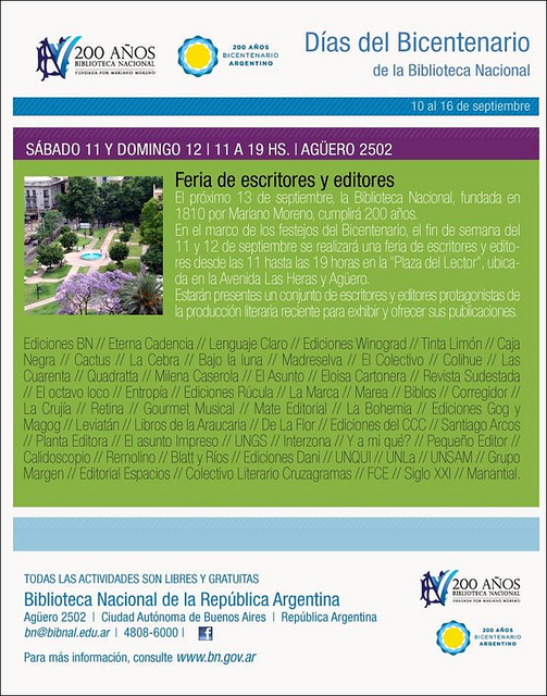 Hoy sábado 11 y mañana domingo 12 de septiembre, de 11 a 19 hs., escritores y editores independientes organizamos una Feria en la explanada de la Biblioteca Nacional, Agüero 2502, Buenos Aires, Argentina. Es un doble festejo: por los 200 años de la Biblioteca y por el Mes de la Bibliodiversidad. Todo lo mejor del catálogo de las editoriales independientes, y un montón de cosas más. ¡Los esperamos!
